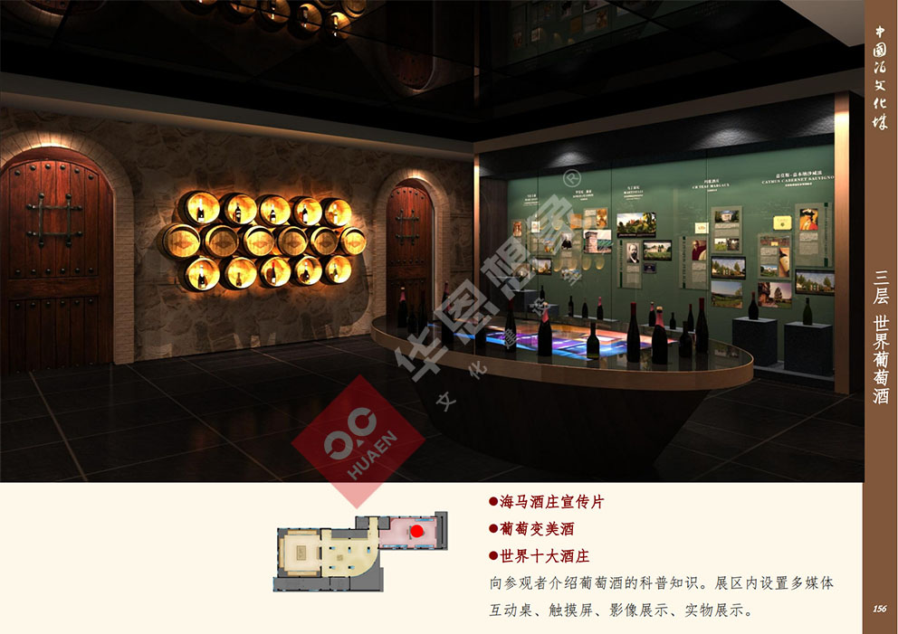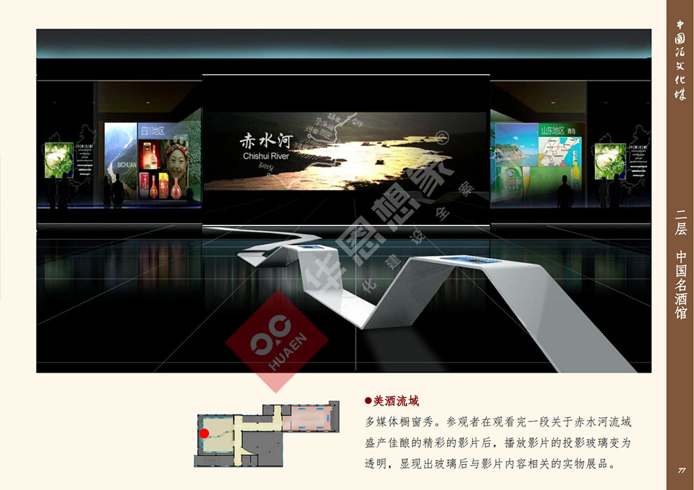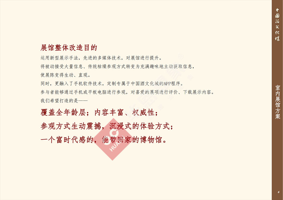 設(shè)計理念:展館整體改造目的運用新型展示手法,先進的多媒體技術(shù),對展館進行提升。將被動接受大量信息、傳統(tǒng)枯燥參觀方式轉(zhuǎn)變?yōu)槌錆M趣味地主動獲取信息,使展陳變得生動、直觀同時,更融入了手機軟件技術(shù),定制專屬于中國酒文化城的APP程序。參與者能夠通過手機或平板電腦進行參觀,對喜愛的展項進行評價、下載展示內(nèi)容我們希望打造的是一一覆蓋全年齡層,內(nèi)容豐富、權(quán)威性;參觀方式生動震撼,沉浸式的體驗方式;一個富時代感的,能帶回家的博物館。